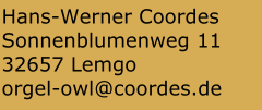 Über Informationen, Hinweise oder Material freue ich mich ! Auch für Fragen, Kritik und Diskussionen stehe ich gern zur Verfügung. Sagen Sie mir Ihre Meinung. Ebenso sind Kontakte zu OrgelfreundInnen erwünscht.